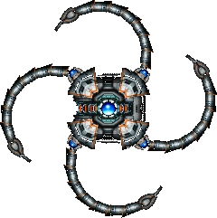 Covered Tetran flails its arms for a few seconds after appearing. During this time, it is invulnerable, even though the core is open. After this, it slowly rotates its arms around the main core, like the normal Tetran. Unlike the normal Tetran, it fires both bullets and mines. These mines can be destroyed, however. Once two arms are destroyed, it will begin to spin them rapidly around its body, making it difficult to approach. It will spin its last arm faster to compensate for the lost ones. Covered Tetran is actually very difficult to destroy properly. Most players destroy the arms, which kills it anyway.
