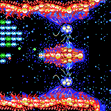 Doom is an organic biomass attached to the floor and ceiling of the stage, controlled by two pod-like brains at the top and bottom. It fights in a similar manner to Nucleus, another bio-organism boss, spreading a huge number of organic balls at the player. In order to defeat it, the player must attack and destroy the two brains.