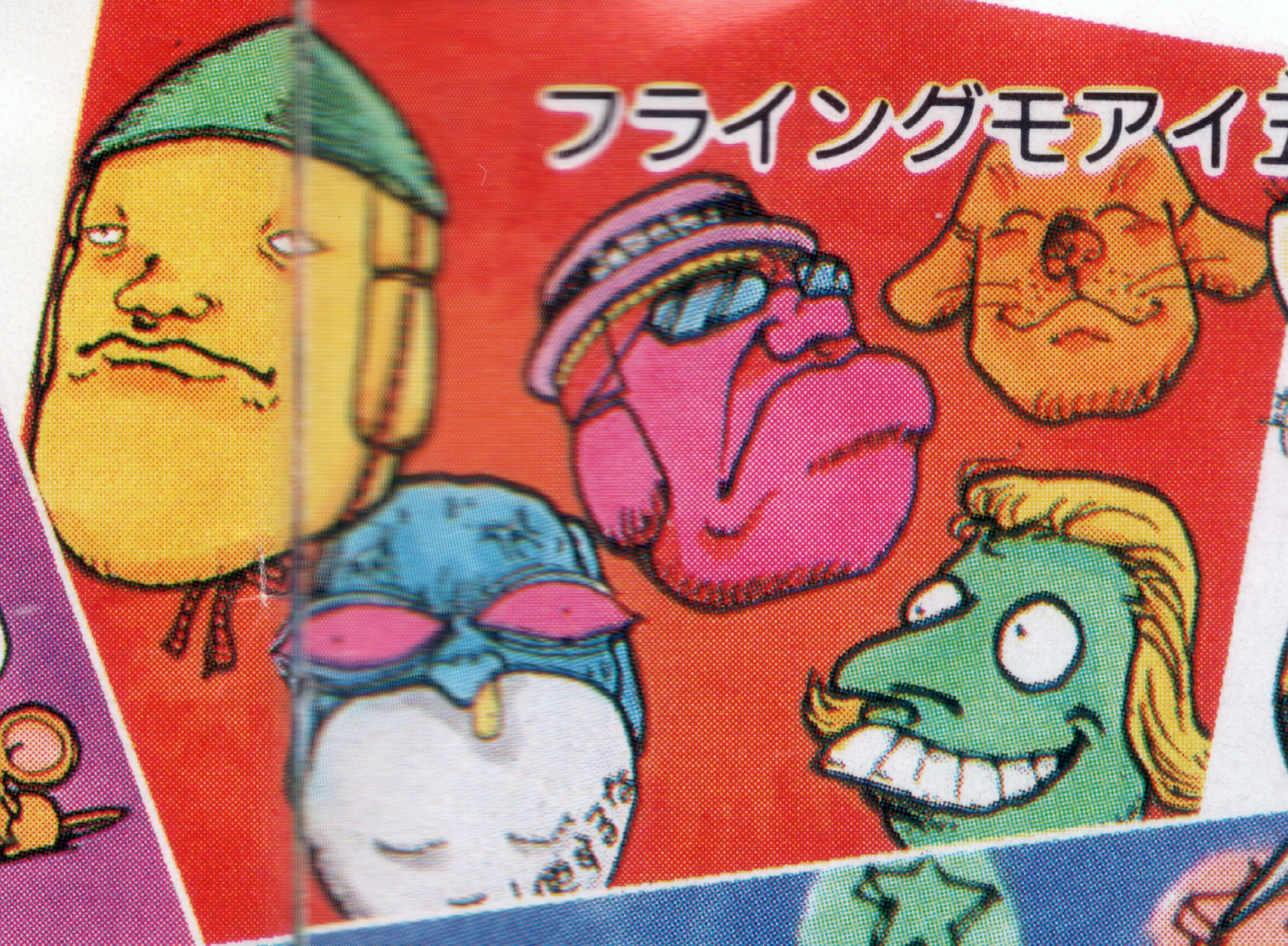The Flying Moai appear as tiny moai heads which fly in a row pattern before shooting small ion rings at the player and leaving the screen. They are a parody of the Fan/Bellberg formations from the Gradius series and their variations. Each Parodius game features a different group of Flying Moai, each individual wearing a unique goofy makeup.