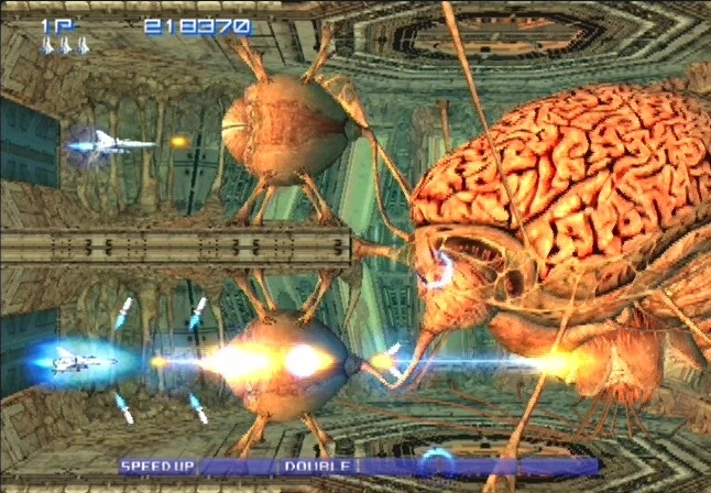 This is the last stage of Gradius V. It is the same stage as first portion of Stage 2, but this time, the roles are reversed, the Vic Viper is going to the top, while the Vic Viper from the past has to deal with the bottom part. Their goal is to end this once and for all by destroying Venom brain. In the beginning, Zubs will spawn as usual from Stage 2 with an added twist: Swarms of Option Hunters will appear behind the ship, attempting to steal options.